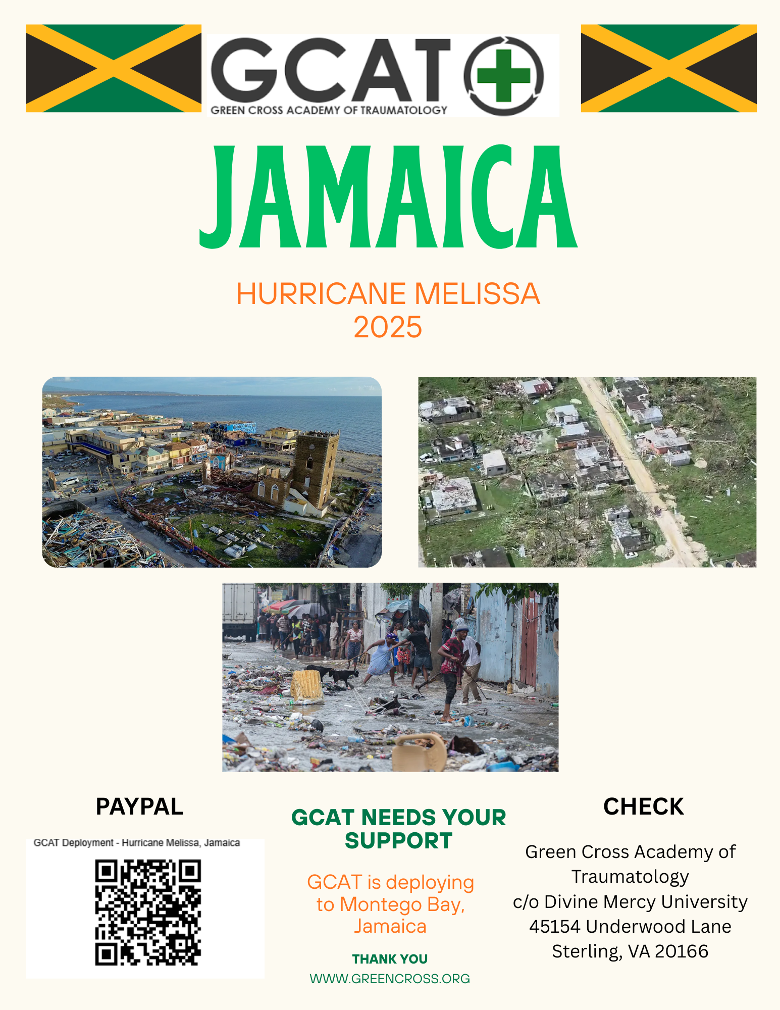 Green Cross Academy of Traumatology (GCAT) has been invited to provide Psychological Trauma Care to the Survivors of Hurricane Melissa in Jamaica. We are counting on our members and supporters to assist us in responding to this call. For those who are unable to physically deploy, your prayers and financial support would be greatly appreciated. Click HERE to donate or scan the barcode.